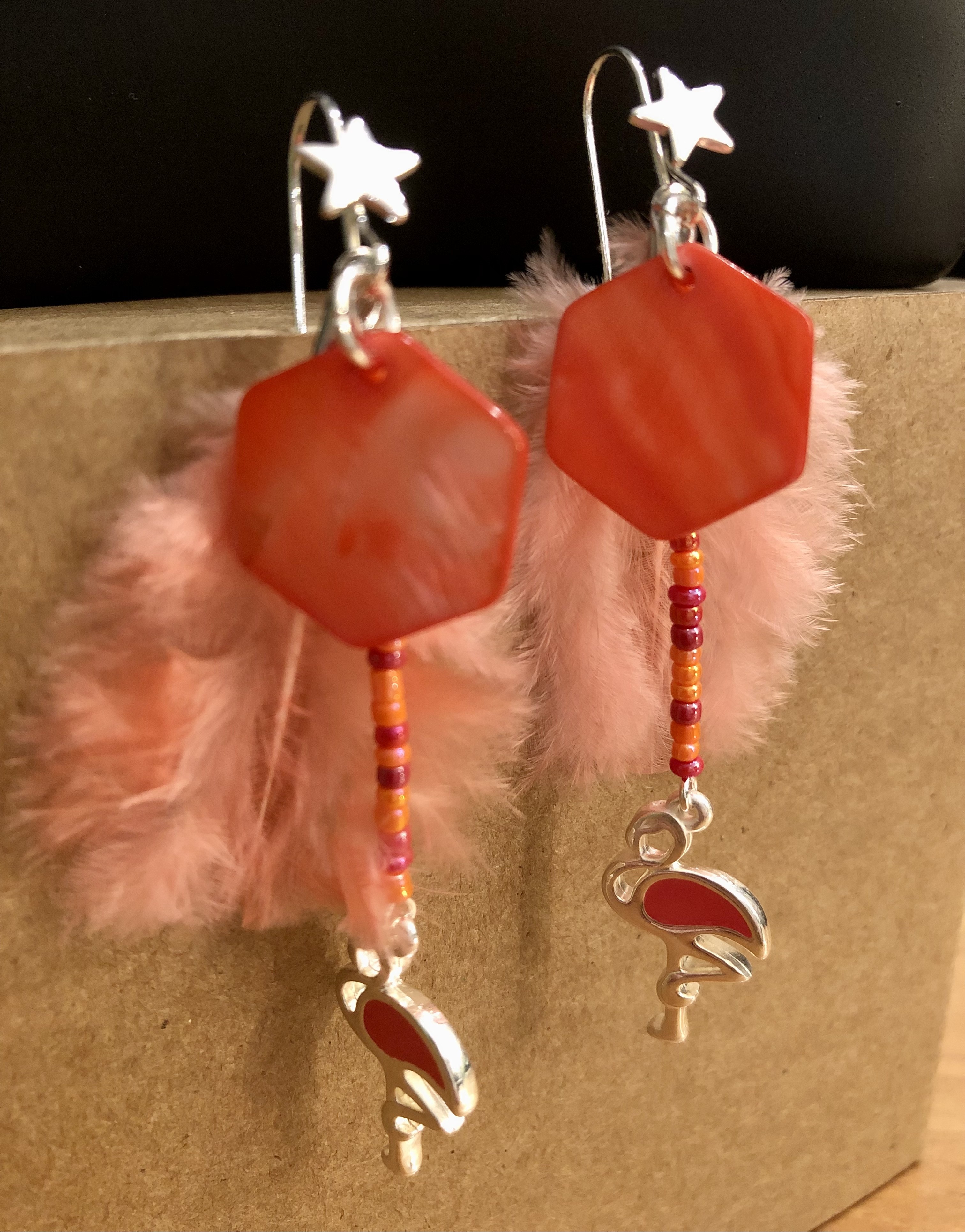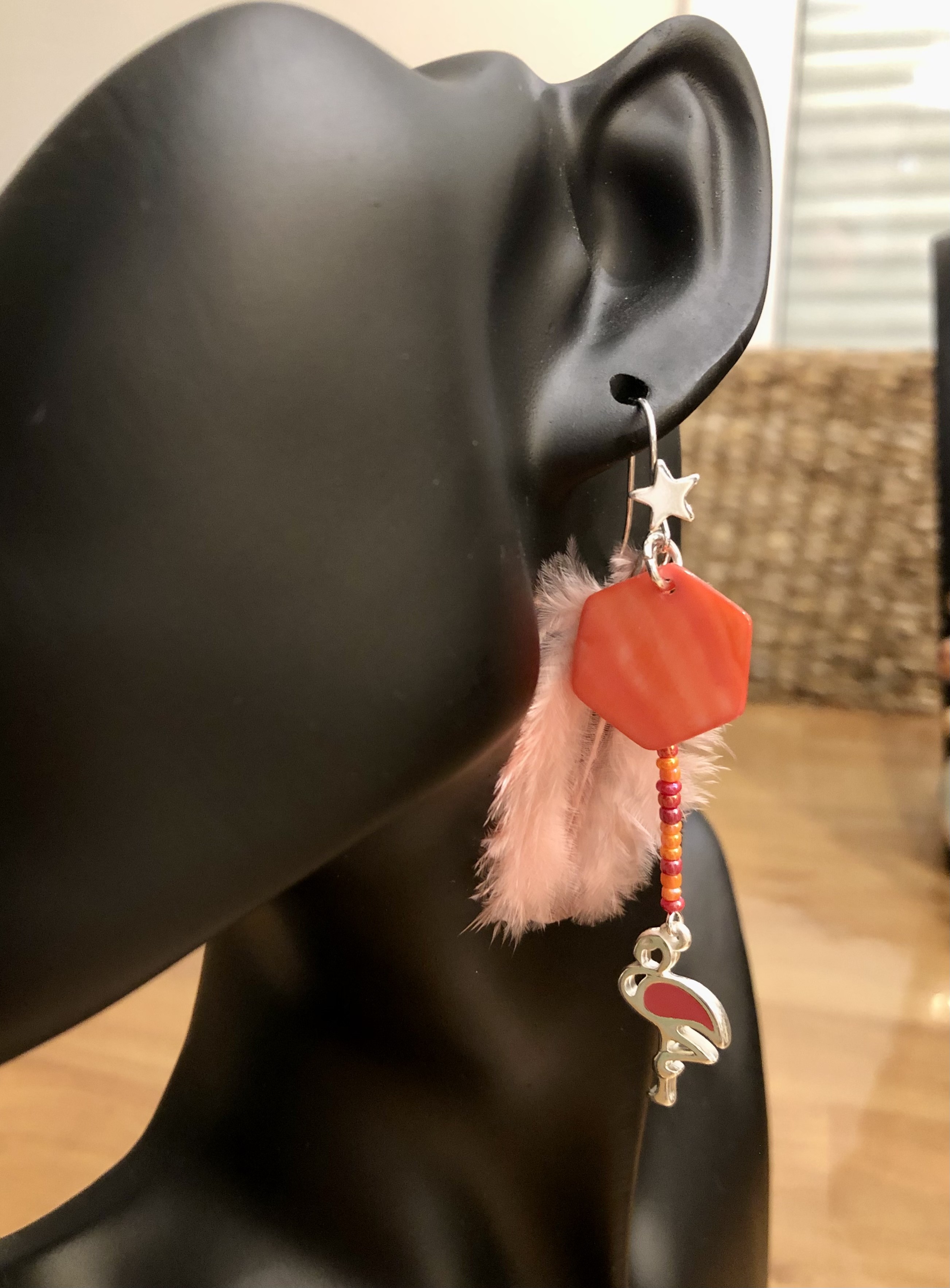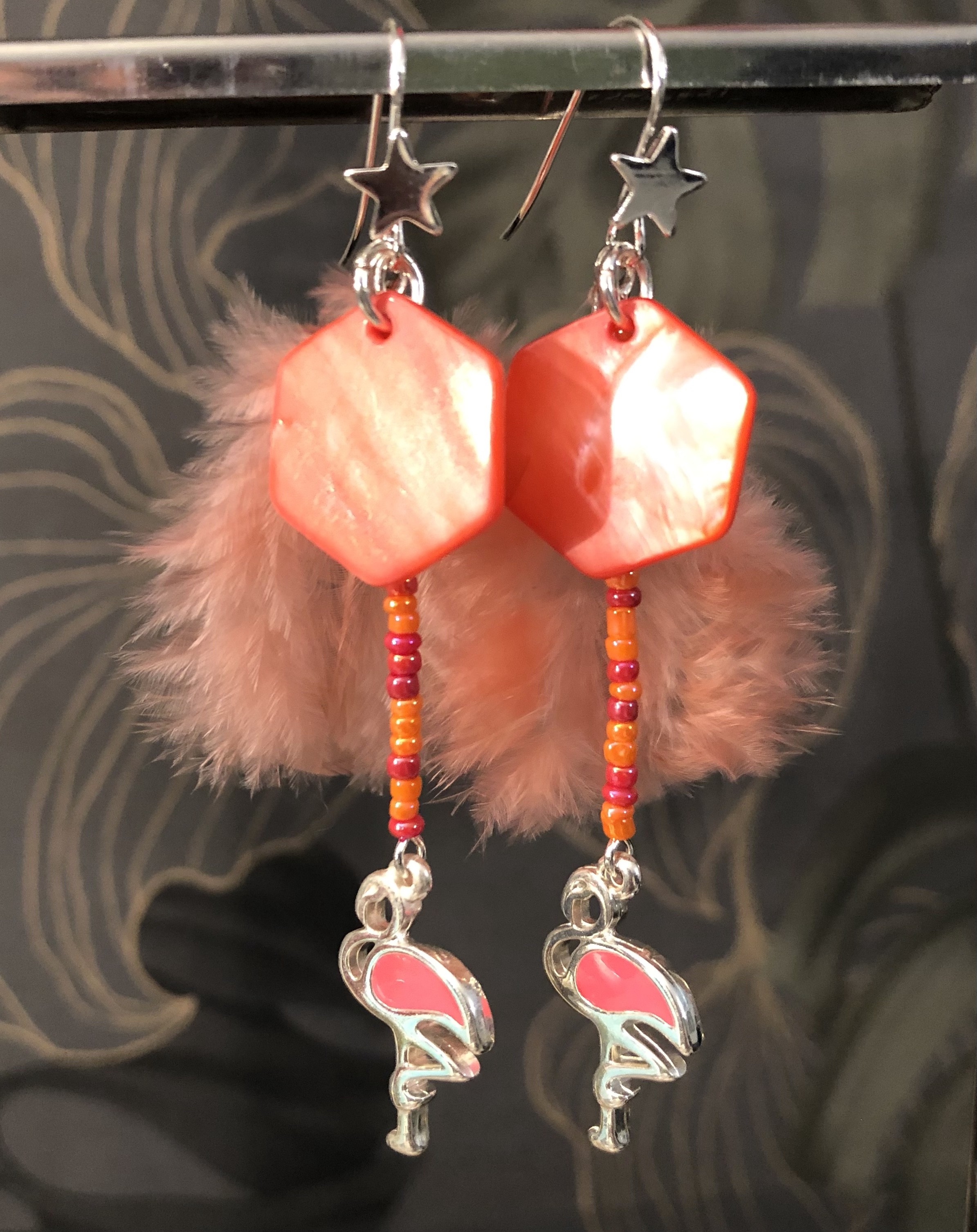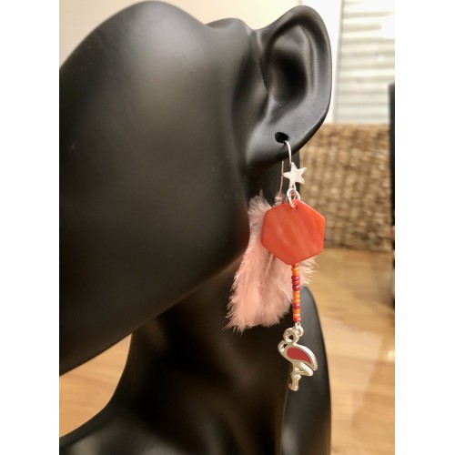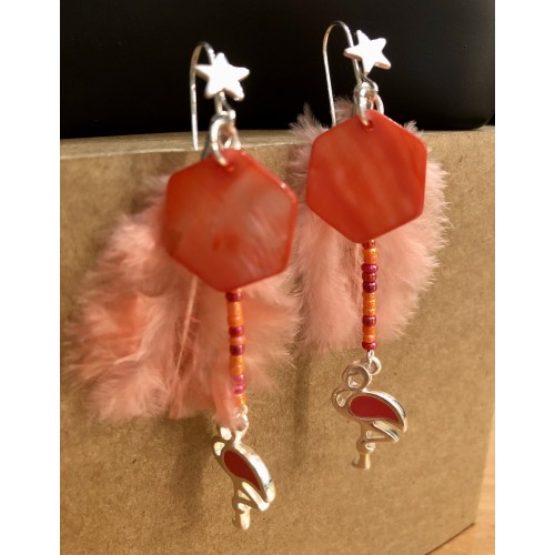 Nacre, perles de verre, plume et breloque Flamand Rose