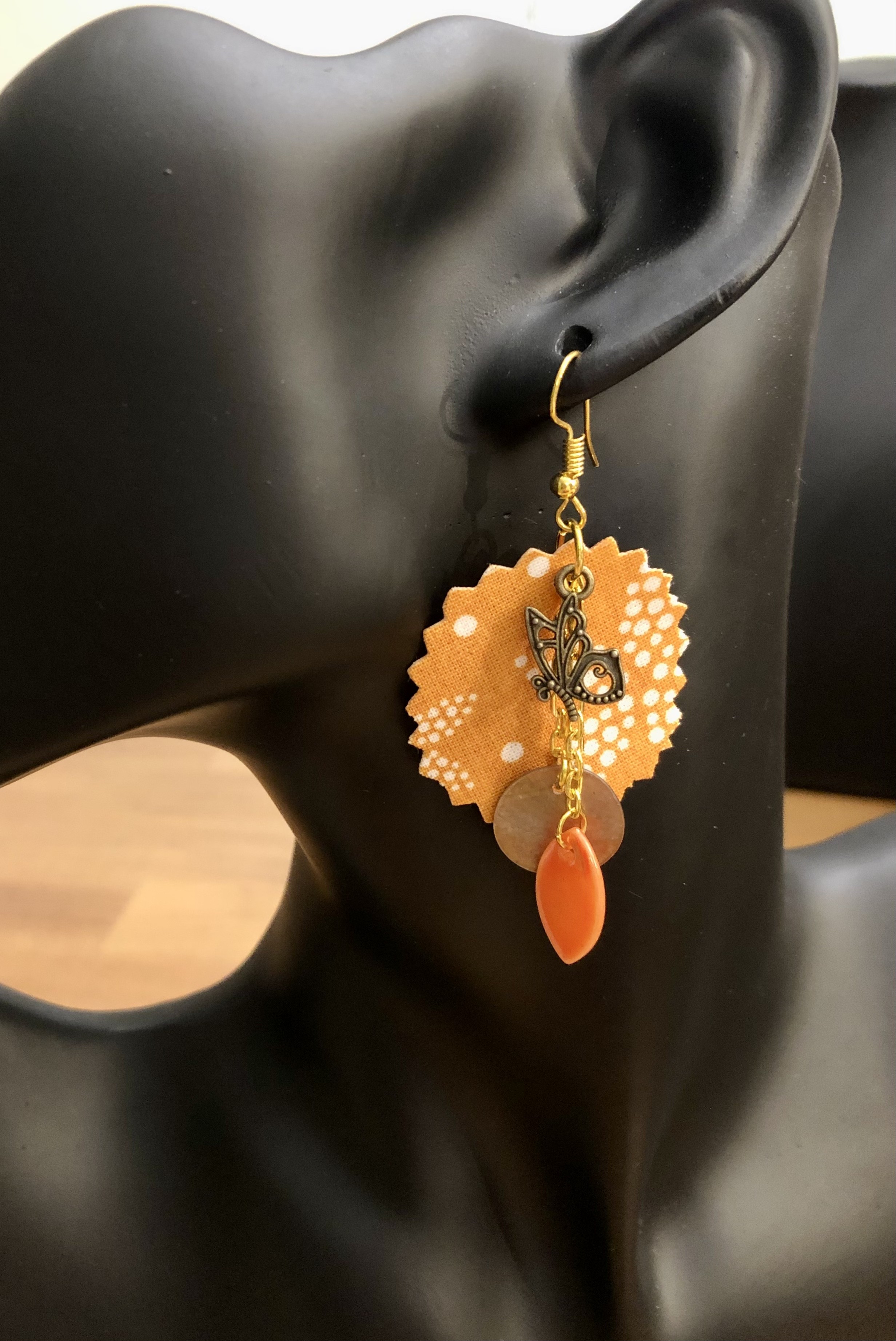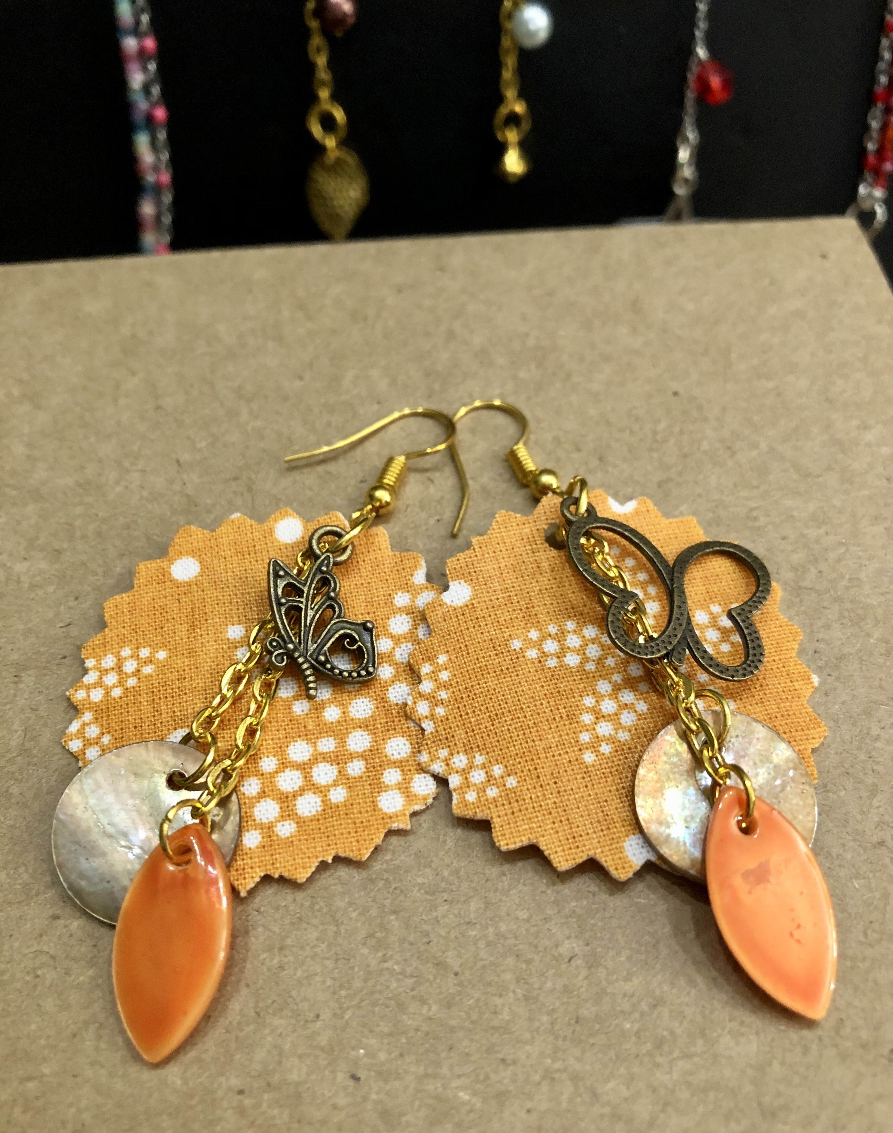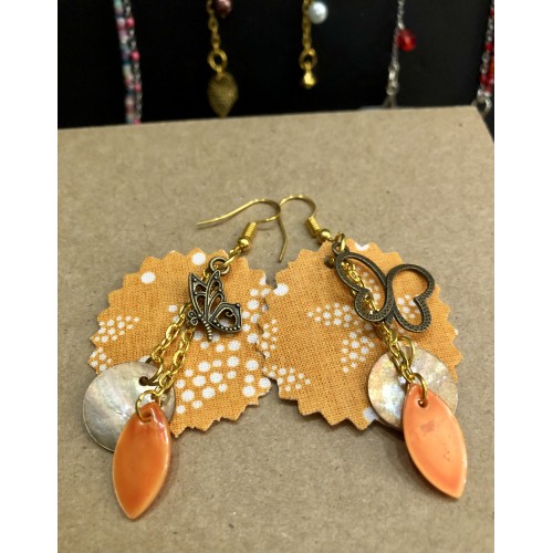 Tissu (récupéré de mes confections diverses), perles de nacre et breloques dorées.